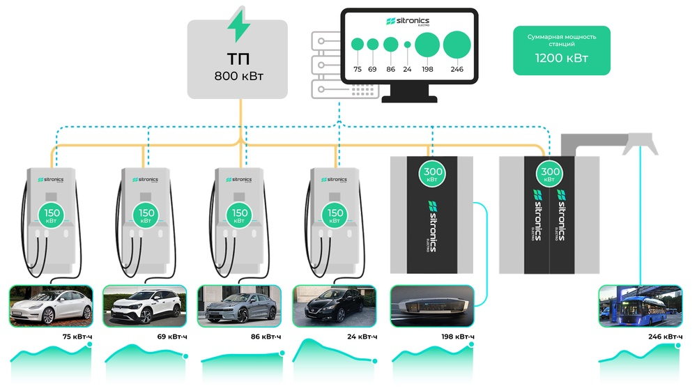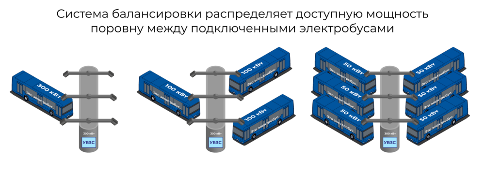 Система балансировки мощности универсальна: к ней можно подключать электрозарядные станции (ЭЗС) для любого транспорта (электромобили, электросуда и т.д.). На схеме наглядно показано, как она работает. Если трансформаторная подстанция выдает мощность 600 киловатт, то ее может хватить только на четыре быстрые зарядки по 150 киловатт. Балансировка же позволяет использовать большее количество станций (в том числе и УБЗС), распределяя мощность в зависимости от потребления каждой из них в конкретный момент времени. Таким образом, для пяти ЭЗС и одной УБЗС вместо 1050 киловатт может хватить и 600.