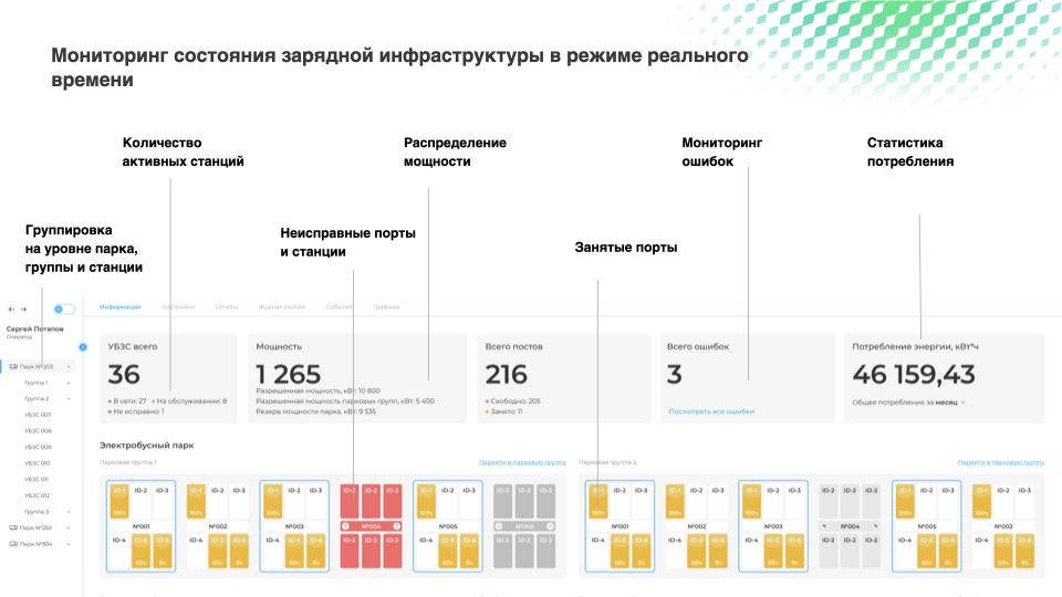 Если говорить более детально, в системе отображаются актуальные статусы станций, исправные и неисправные порты, статистика потребления энергии, система балансировки мощности, ошибки на станциях, телеметрия станции (температура, выходная мощность) и т.д. Кроме того, что система функциональна, она еще и удобна для пользователя благодаря простому и понятному интерфейсу.